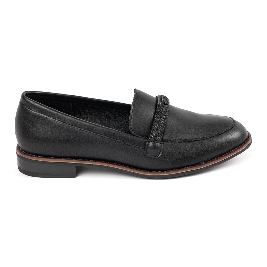 Svarta loafers med en läderinsats från Sergio Leone är det perfekta valet för kvinnor som letar efter kombination av elegans och komfort. Dessa klassiska skor, gjorda av ekologiskt läder, kännetecknas av en minimalistisk design, vilket gör att de matchar många vardagliga och mer överdådiga stiliseringar.