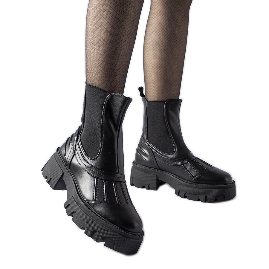Den eleganta svarta färgen och avsaknaden av onödiga mönster gör att arbetarna är lätta att matcha till olika stilar. Den runda näsan ger dem inte bara karaktär, utan garanterar också komfort att bära. Den massiva siluetten av skon, med en ankelhöjd, ger inte bara stöd för fötterna, utan ger också självförtroende i steget. Den 6 cm höga platta hälen lägger till några centimeter utan att kompromissa med komforten.