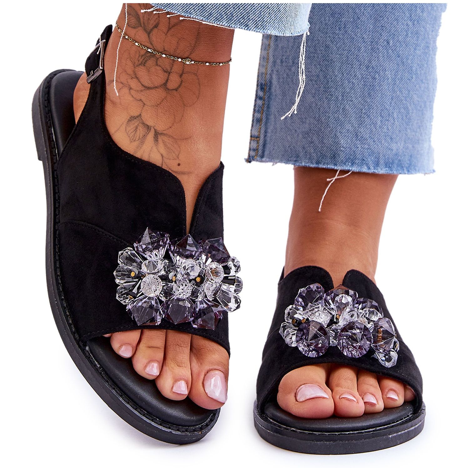 Dekorerade på framsidan med plaststenar som effektivt imiterar diamanter, kommer Vinceza Damsandaler i mocka med Stones Black Mersea säkerligen att locka uppmärksamhet och ge glans till sommarstyling. Sandalernas luftiga design är perfekt för både strandpromenader och kvällsutflykter.