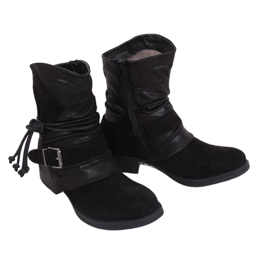 Svarta militärstövlar 201802-11B Svarta är ett idealiskt förslag för kvinnor som värdesätter inte bara ett moderiktigt utseende, utan också komforten att bära. Dessa stövlar kännetecknas av sin militära stil, vilket gör dem till ett perfekt komplement till casual och militära stilar.