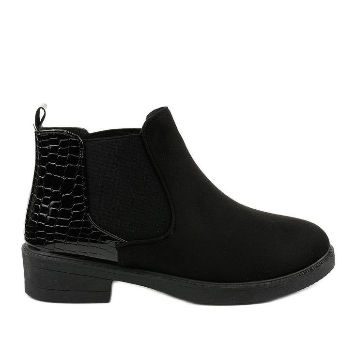 Baksidan av stövlarna är dekorerad med lackläder, som imiterar ormskinn, vilket ger dem en unik karaktär. De har en rejäl syntetsula med en lätt förtjockning under hälen, vilket säkerställer stabilitet och komfort under användning.