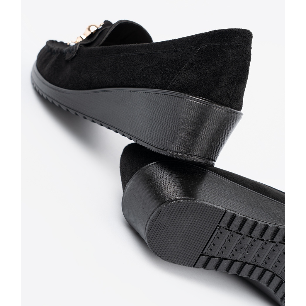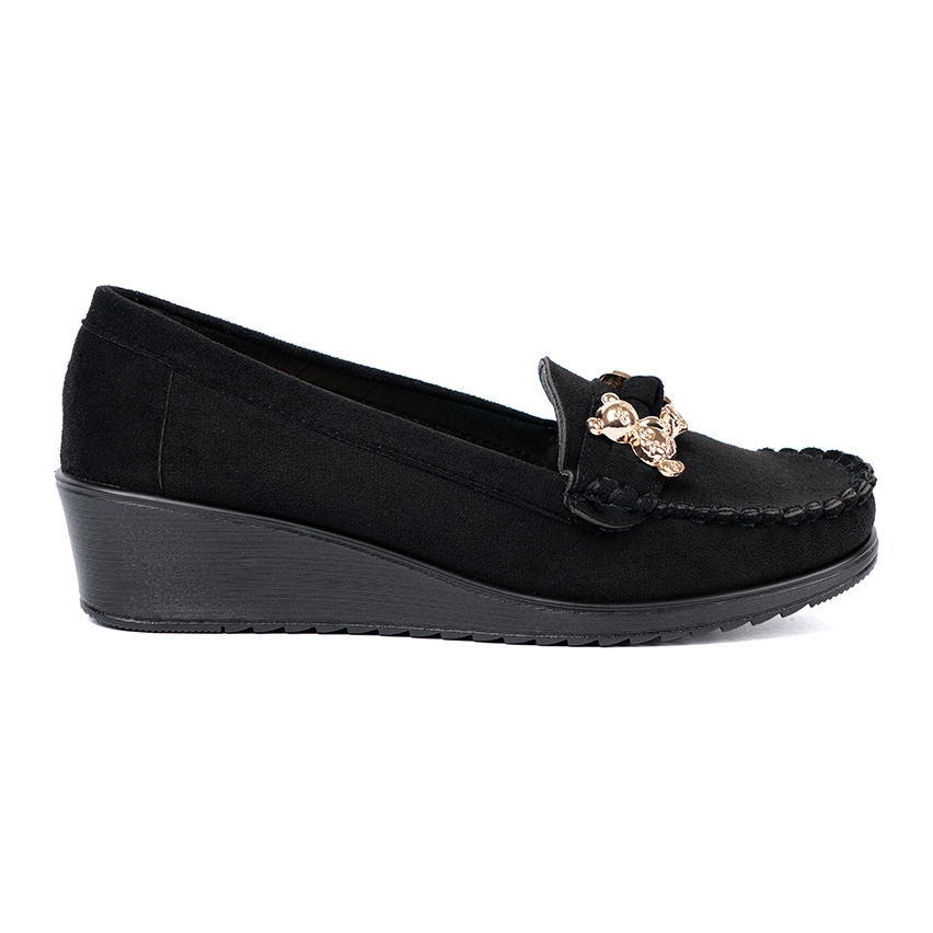 Tillverkad av högkvalitativ imitationssmocka, skor kännetecknas av en mjuk och trevlig till beröringsytan, och en inbyggd och stiven häl ger maximalt stöd för foten. Tack vare en 4 cm hög kil kommer du att känna dig både snygg och bekväm under dagen.