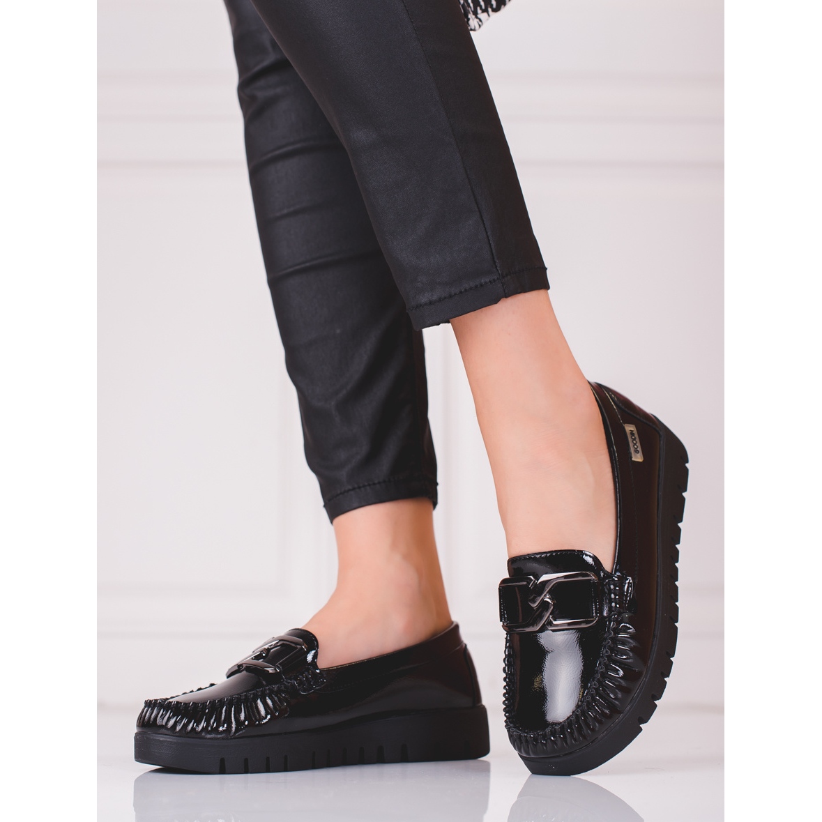 Mockasinerna har en inbyggd, mjuk klack, vilket säkerställer bärkomfort och stabilitet. Den 3 cm höga plattformen tillför lätthet till siluetten och låter dig samtidigt röra dig fritt. Tillverkade av högkvalitativa material erbjuder de en perfekt kombination av konstläder och naturligt innerläder, vilket garanterar inte bara estetik, utan också hållbarhet och komfort.