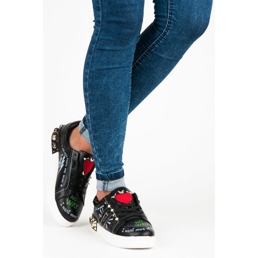Svarta sneakers kännetecknas av en mycket uttrycksfull design som lockar uppmärksamhet. Många dekorationer, inklusive dubbar och unika inskriptioner, ger dem en rockkaraktär, vilket gör dem till ett idealiskt val för kvinnor som vill sticka ut från mängden. Men deras attraktiva utseende är inte allt - en bekväm innersula i tyg gör att bära dessa skor till ett nöje även under många timmar.