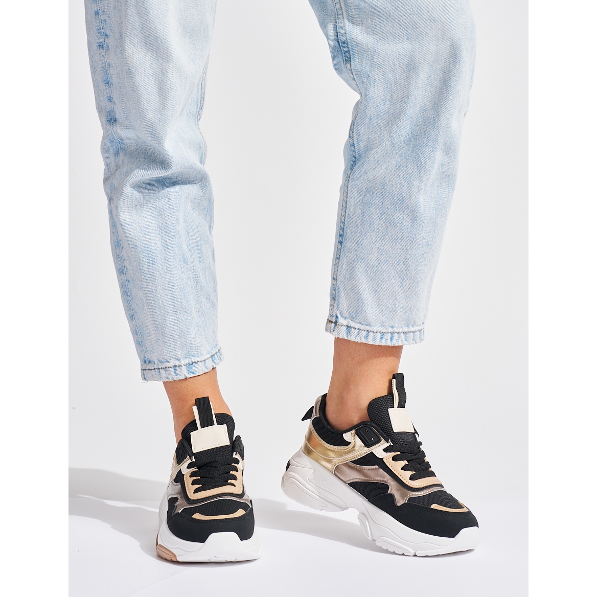 Detaljer: Svarta och guldiga sneakers med tjock sula