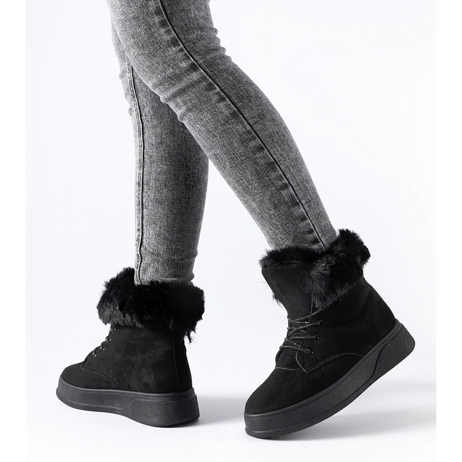 Stylish and Practical - Black Snow Boots Oliverio är den perfekta kombinationen av fashionabla design och funktionalitet för höstens säsong. Den insatta strukturen med ytterligare snörning säkerställer snabb att sätta på och en god passform, och konstgjord pälsisolering garanterar en trevlig känsla av värme även på de kallaste dagarna. Den runda näsan ger skorna en elegant karaktär, och den svarta plattformen med en höjd av 4 cm lägger till några centimeter utan att ge upp komfort.