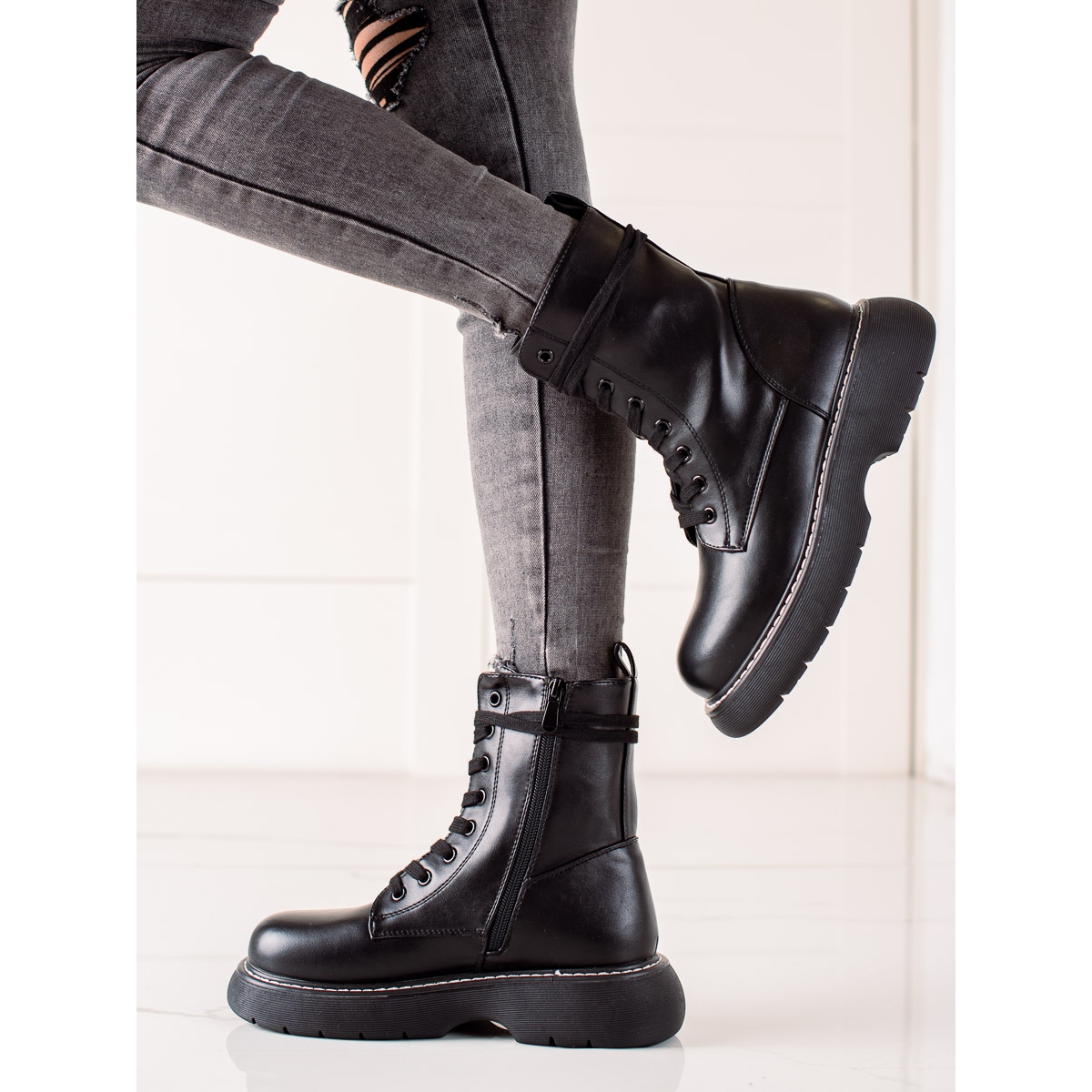 Upptäck en ny stil med svarta plattformsarbetare från varumärket TRENDI. Dessa eleganta ankelboots är det perfekta valet för kvinnor som letar efter en kombination av komfort och moderiktig design. Tillverkade av högkvalitativt läderimitation säkerställer de hållbarhet och ett estetiskt utseende som passar perfekt in i en avslappnad, vardaglig stil.