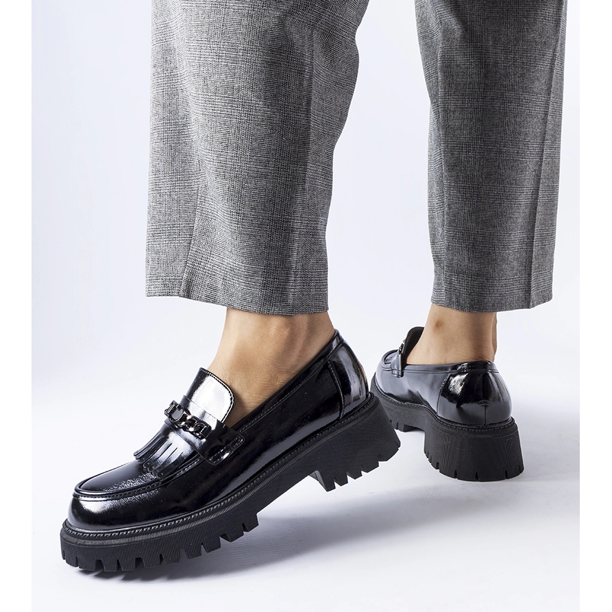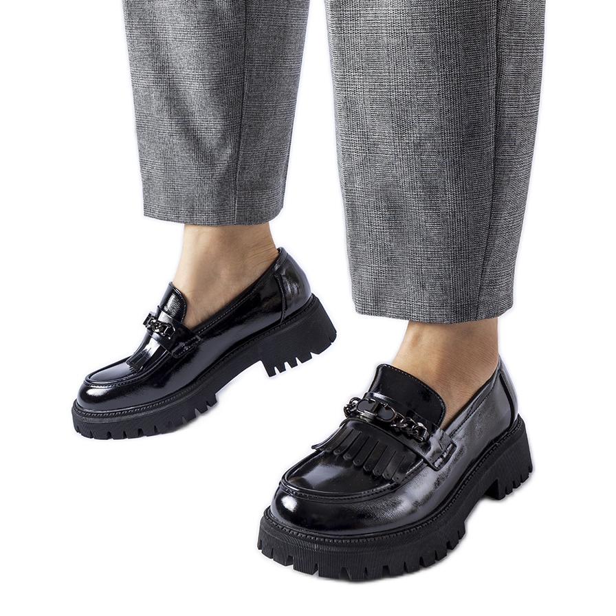 Mockasinerna är gjorda av högkvalitativt ekologiskt patentläder, vilket gör att de ser extremt imponerande ut. Den svarta finishen framhäver deras raffinerade karaktär, och ytterligare element i form av ett spänne och fransar ger dem en fashionabel accent.