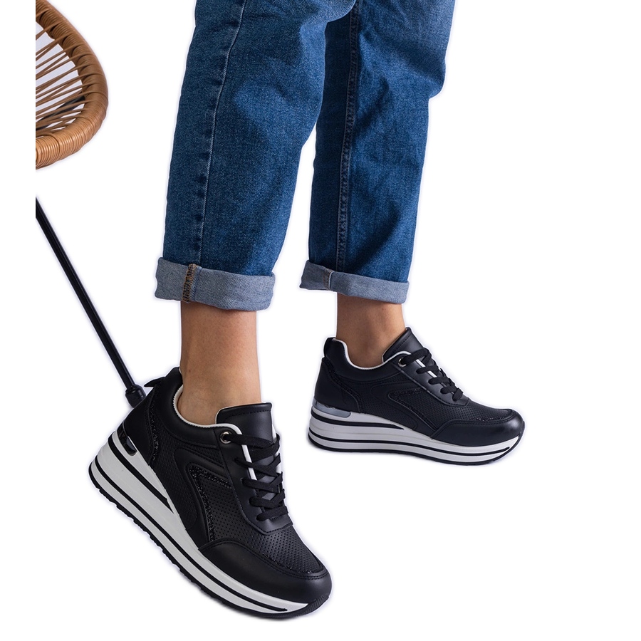 Vi presenterar svarta sneakers på plattformen (HY91005 -modell), som kombinerar elegant design med exceptionell komfort. Dessa fashionabla skor kännetecknas av en elegant brokaddekoration och en metallinsats som ger dem en original karaktär.