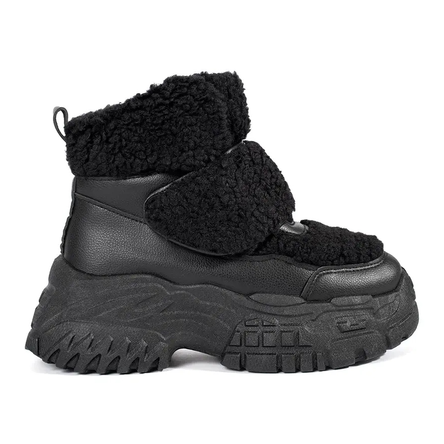 Seastar svarta snöstövlar kännetecknas av en 7 cm hög plattform, som tillför stil och optiskt förlänger benen, samtidigt som man säkerställer stabilitet när du går. Kardborrfästning gör det enklare att ta på sig och ta av, och den omtroliga plastsulan säkerställer ett visst steg på olika ytor.