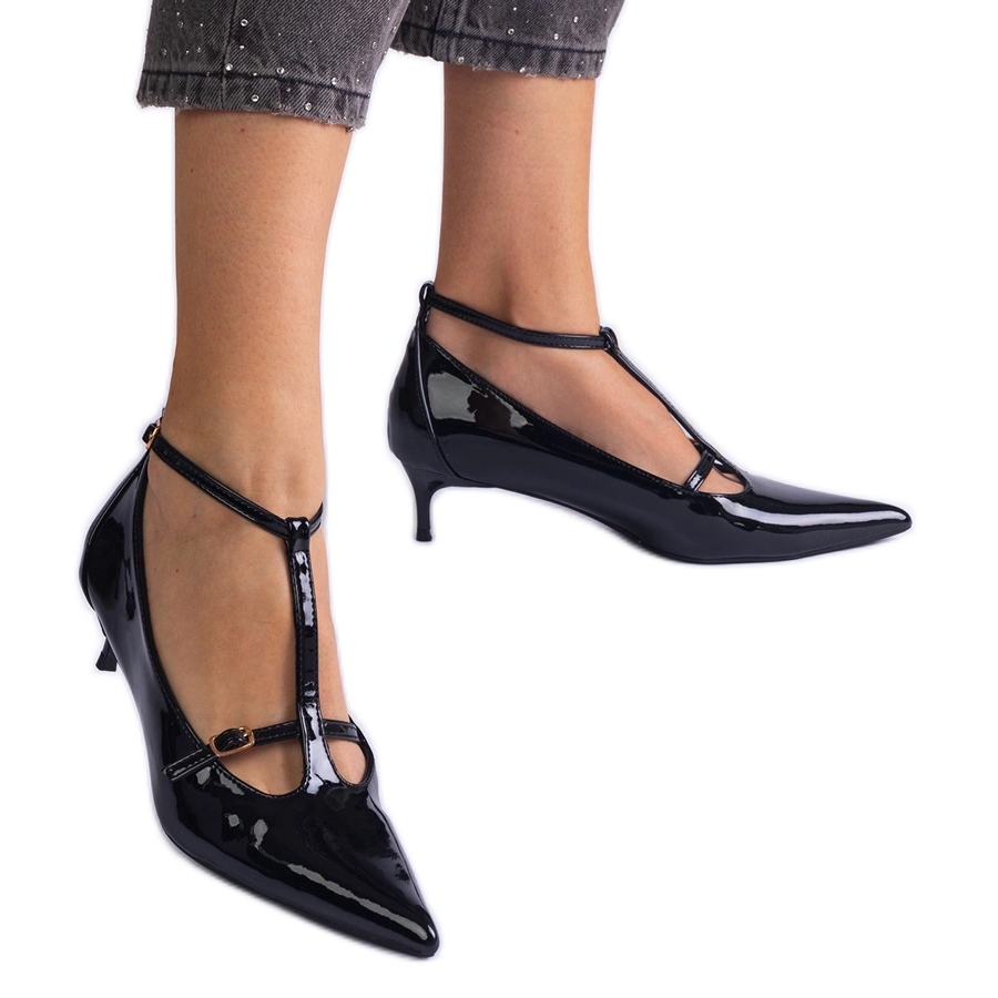 Detaljer: Svarta pumpar lackade på en låg hög med spännen