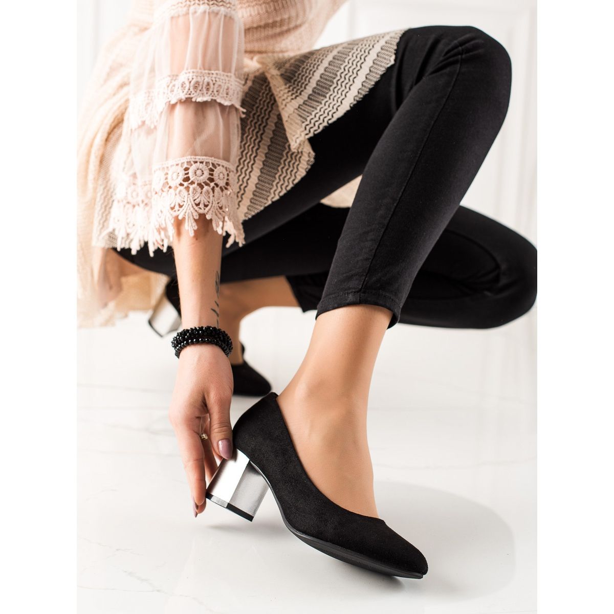 Svarta M.Daszyński pumps är det perfekta valet för varje kvinna som värdesätter elegans och komfort i ett. Tillverkade av högkvalitativt ekologiskt läder som imiterar mocka, matchar dessa skor perfekt modetrender och erbjuder en klassisk och elegant stil. Den runda näsan och en stabil 6 cm hög stolpe säkerställer inte bara ett moderiktigt utseende, utan också komfort att bära hela dagen.