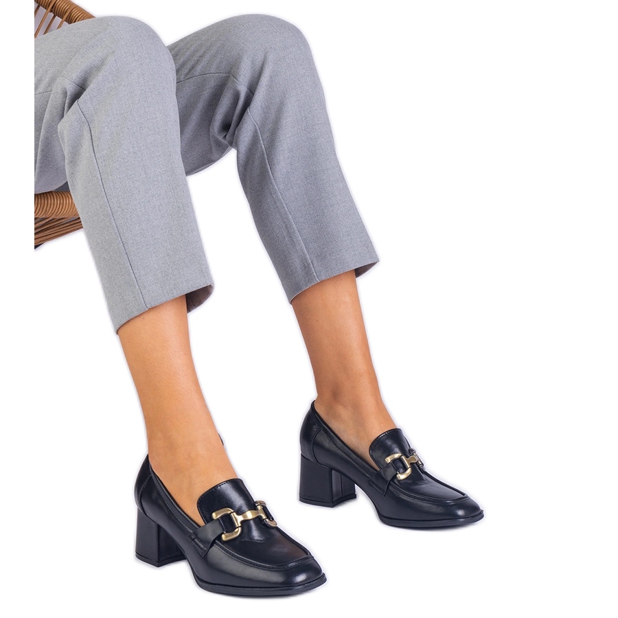 Svarta pumpar smälter in perfekt med olika stiliseringar, och den svarta plastkulan garanterar hållbarhet och stabilitet. Inuti finns det en ekologisk läderinsats, som ytterligare ökar med komfort.