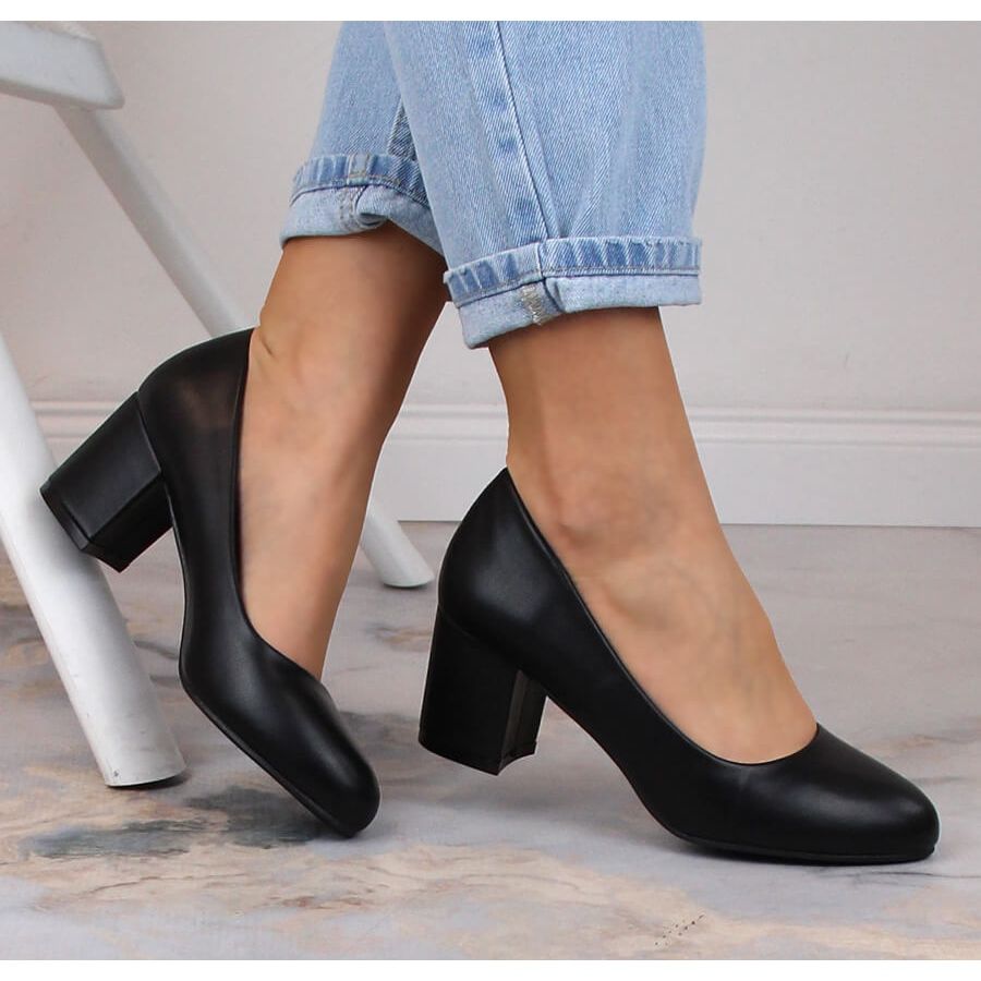 Dampumpar med svarta klackar eVento 5950 är ett elegant förslag från märket Evento, som säkert kommer att glädja älskare av fashionabla och bekväma skor. Dessa pumps är gjorda av högkvalitativt ekologiskt läder och kännetecknas av en klassisk svart färg, vilket gör att de matchar många stilar - från casual till mer formell.