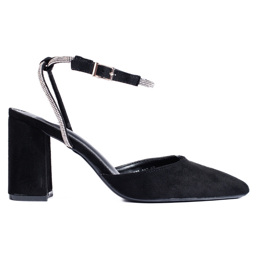 Svarta mockapumps med öppen klack från Shelovet är också dekorerade med subtila strass, vilket ger exklusiv glans till helheten. Den extra silverfärgen är en diskret men raffinerad accent.