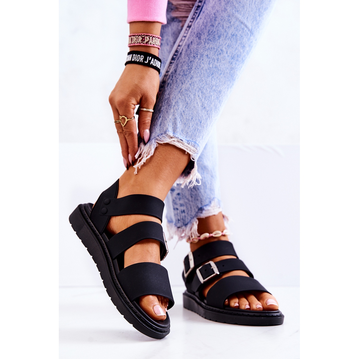 Vi presenterar FM1 Black Reese Buckle Sandaler - det perfekta valet för sommardagar! Dessa snygga sandaler är gjorda av högkvalitativt gummiliknande material, vilket säkerställer lätthet och komfort att bära. Tack vare den justerbara remmen som fästs med ett spänne kan du enkelt anpassa dem till bredden på ditt ben, vilket garanterar en perfekt passform.