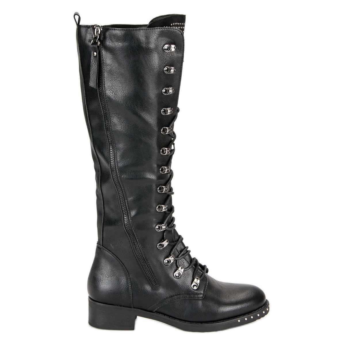 Deras klassiska form i kombination med den eleganta svarta färgen gör att dessa stövlar framgångsrikt kompletterar både elegant, avslappnad och rockig stil. Strassar placerade under snören och på sulan ger dem en djärv karaktär, vilket gör att du sticker ut från mängden.