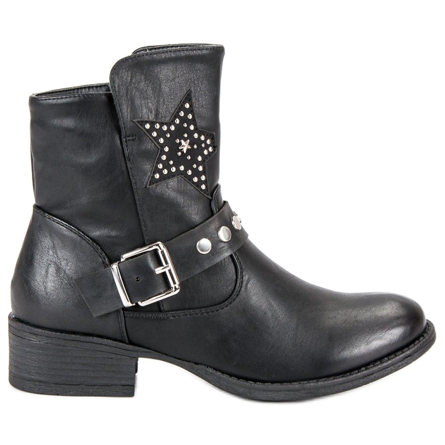 Upptäck din rocksida med våra unika svarta ankelboots, som kommer att bli en oersättlig del av din garderob. Stilen på dessa skor är iögonfallande - ett elegant dekorativt spänne och en subtil stjärna gjord av pärlor ger dem en unik karaktär. Dessa stövlar matchar perfekt med rockstyling, men de passar också vardagliga, avslappnade outfits.