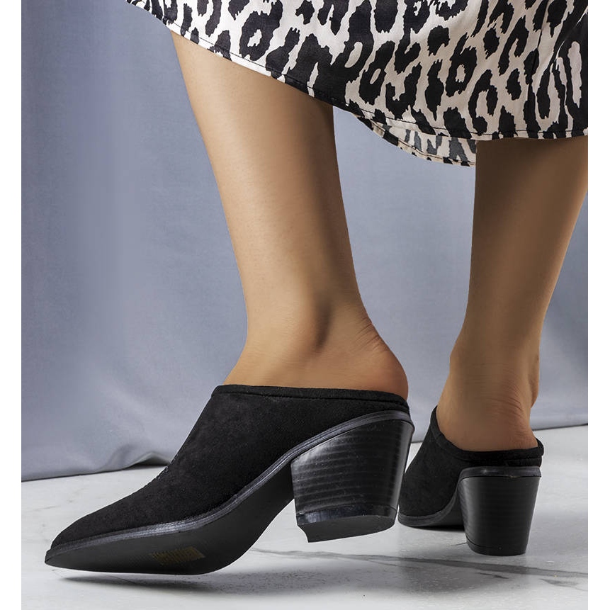 Svarta rutschbanor med stängd front från Linda är ett måste i varje sommargarderob. Dessa eleganta och bekväma damflip-flops drar till sig uppmärksamhet med sin unika stil, som refererar till cowboyskor. En bred, lätt lutande 6 cm hög klack och en spetsig tå ger dem elegans och den uppbyggda ovandelen lyfter perfekt fram fotens fördelar.