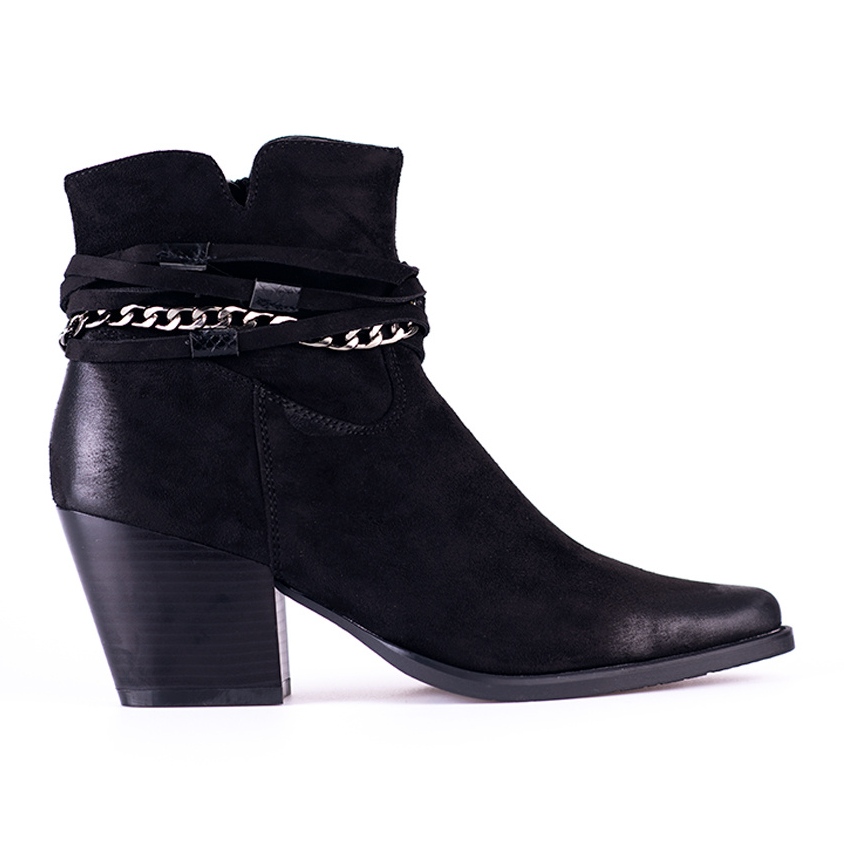 Bär gärna dessa ankelboots för både vardagliga tillfällen och speciella stunder. Den eleganta svarta färgen och dekorativa kedjan, som är ett original designelement, kommer att säkerställa ett vackert utseende. Klackhöjden är bekväma 7 cm - en perfekt lösning för att kombinera estetik med komfort.