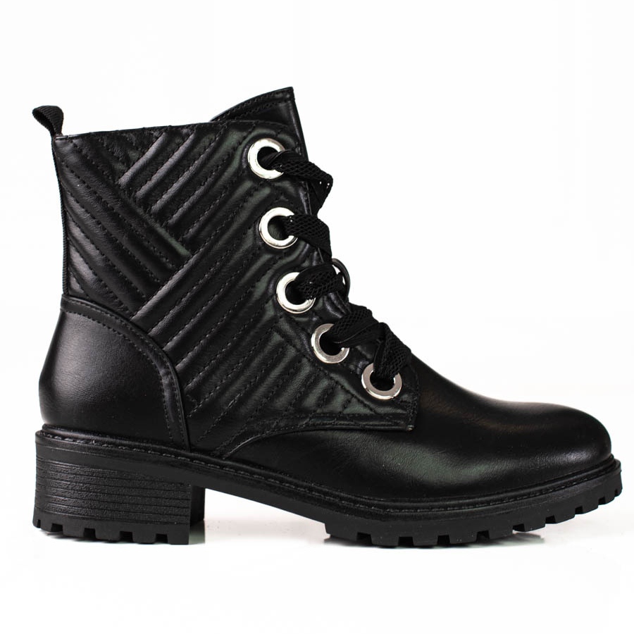 Upptäck unik stil och komfort med Shelovet kvinnors svarta ankelstövlar med snörning med quiltning. Dessa eleganta skor är ett perfekt val för höst/vintersäsongen, perfekta för dagligt bruk, i en avslappnad eller rockig stil. Tillverkade av högkvalitativt ekologiskt läder garanterar de inte bara ett moderiktigt utseende, utan också komfort att bära.
