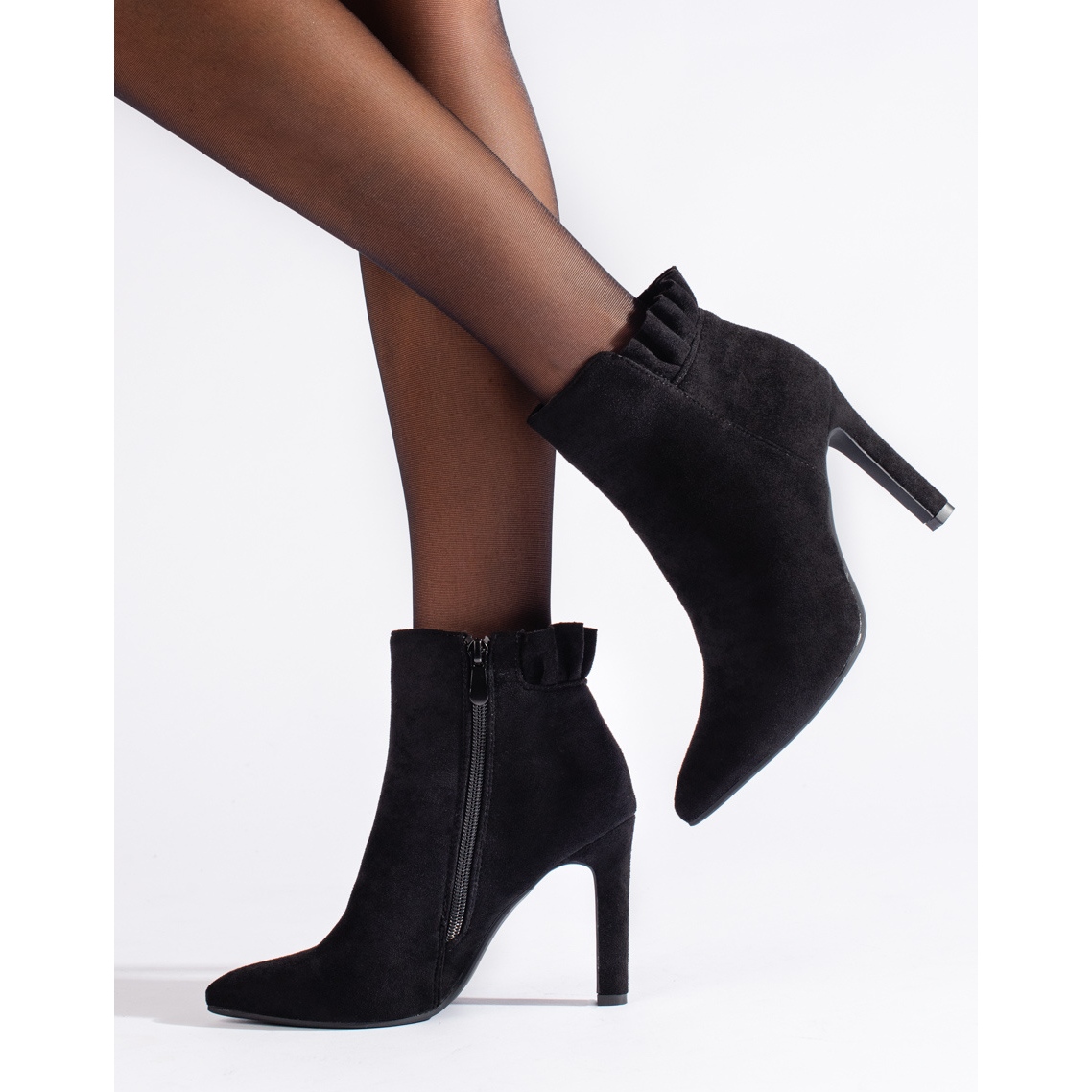 Designen kännetecknas av en elegant spetsig tå, som tillför elegans och optiskt förlänger benet. En 10 cm hög stilett garanterar en imponerande siluett, som framhäver benens form och ger självförtroende i ditt steg. Höjden på den smala ovandelen, som når över ankeln, gör dem extremt universella - de kan bäras med både klänningar och jeans.