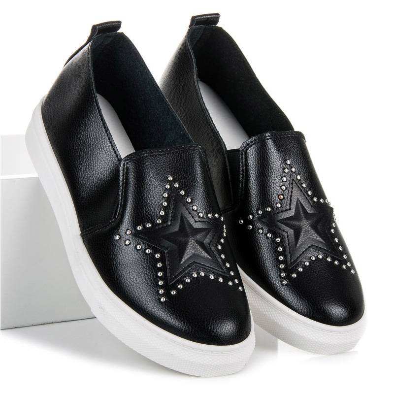 Upptäck unik stil och komfort med svarta slip-ons med en stjärnapplikation! Dessa originalskor är den perfekta kombinationen av moderiktig design och funktionalitet som kommer att möta behoven hos varje kvinna. Gjorda av mjukt ekologiskt läder, slipons är lätta och passar perfekt till foten, vilket gör dem perfekta för vardagsbruk.