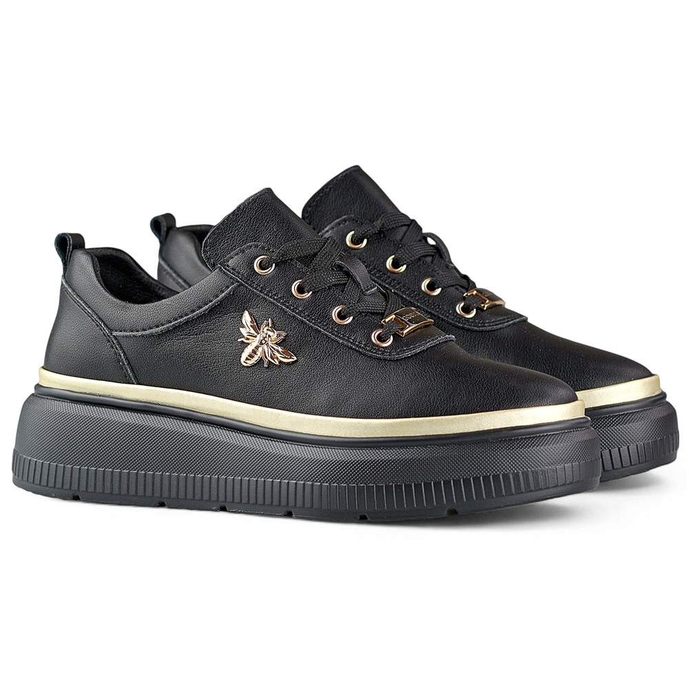 Svart, naturligt läderfinish ger dem en elegant karaktär, som perfekt harmoniserar med fashionabla gyllene accenter och lägger till en subtil anteckning av lyx. Sneakers har en rund näsa, som ger komfort när du bär, och spännen på snören gör att du perfekt kan matcha foten. Deras låga profilform gör dem lätta och bekväma, och plattformen ökar användningen av användningen.