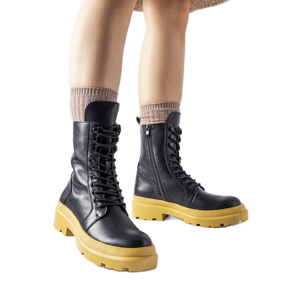 Quennie svart vandring på en färgstark sula - eleganta, varma och bekväma stövlar för höstens säsong. Tillverkad av hög kvalitet ekologiskt läder, isolerad interiör ger termisk komfort, och den kontrasterande gula gummisulan ger hela en modern, modig karaktär. Fick -dragkedjan gör det lättare att ta på sig, och en rund näsa och en platt, 4 -centimeter häl garanti komfort hela dagen.