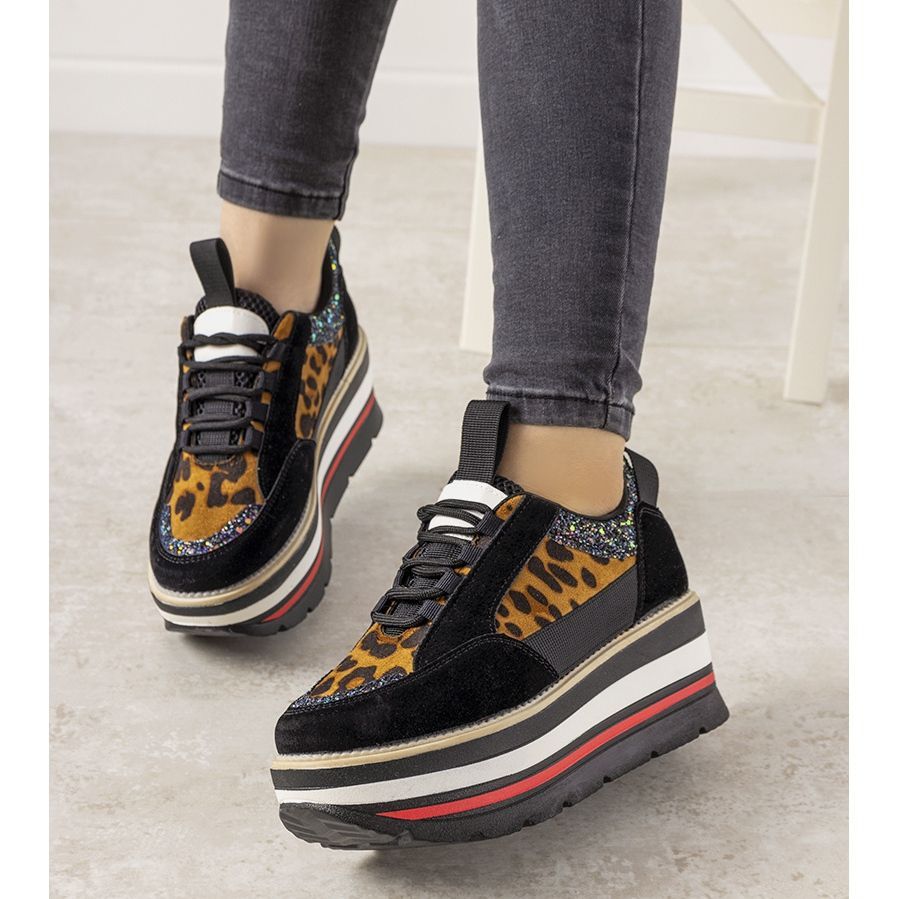Debbis svarta sneakers med höga sulor är den perfekta kombinationen av stil och komfort som kommer att glädja alla modeälskare. Denna modell, berikad med ett unikt leopardmönster och subtilt glitter, sticker ut från andra modeller, drar till sig uppmärksamhet och ger karaktär till varje styling.