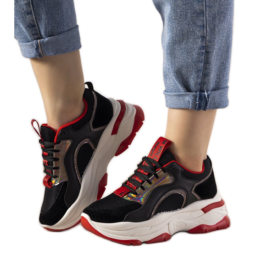 Svarta Freedom sneakers med holografiska inlägg är ett måste i din garderob om du värdesätter stil och komfort varje dag. Dessa sportskor kombinerar moderiktig design med funktionalitet, perfekt matchar en mängd olika stilar. Kombinationen av svart med röda och holografiska accenter kommer säkert att locka uppmärksamhet och lägga till karaktär till vilken outfit som helst.