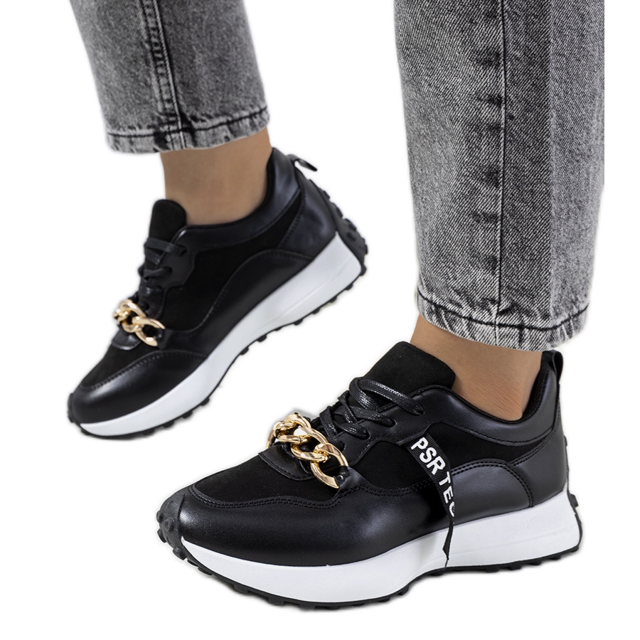 Ovandeln gjord av högkvalitativ eko-mocka och ekologiskt läder i en enhetlig svart färg ser extremt stilig ut. Den massiva guldkedjan är en iögonfallande accent som lägger till feminin charm till sneakers och får dem att sticka ut från andra modeller. Dessutom garanterar deras låga höjd (12 cm) och bekväma snörstängning komfort att bära hela dagen.