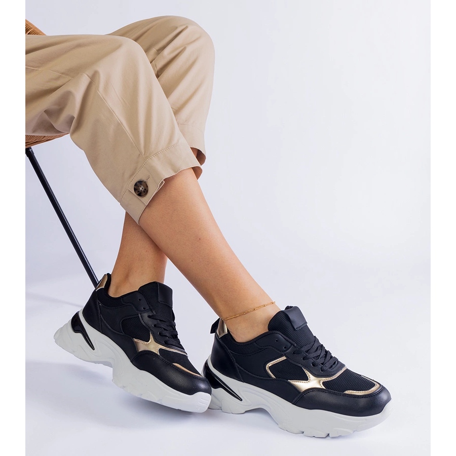 Svarta sneakers på en massiv enda modell C-423 från ett annat märke är kvintessensen av stil och komfort, idealisk för en modern kvinna. Dessa sportskor kombinerar en klassisk, svart färg med eleganta gyllene accenter, vilket gör dem perfekta för nuvarande trender.