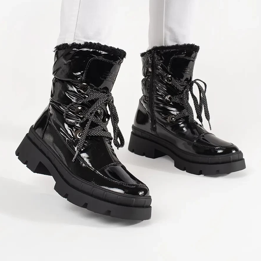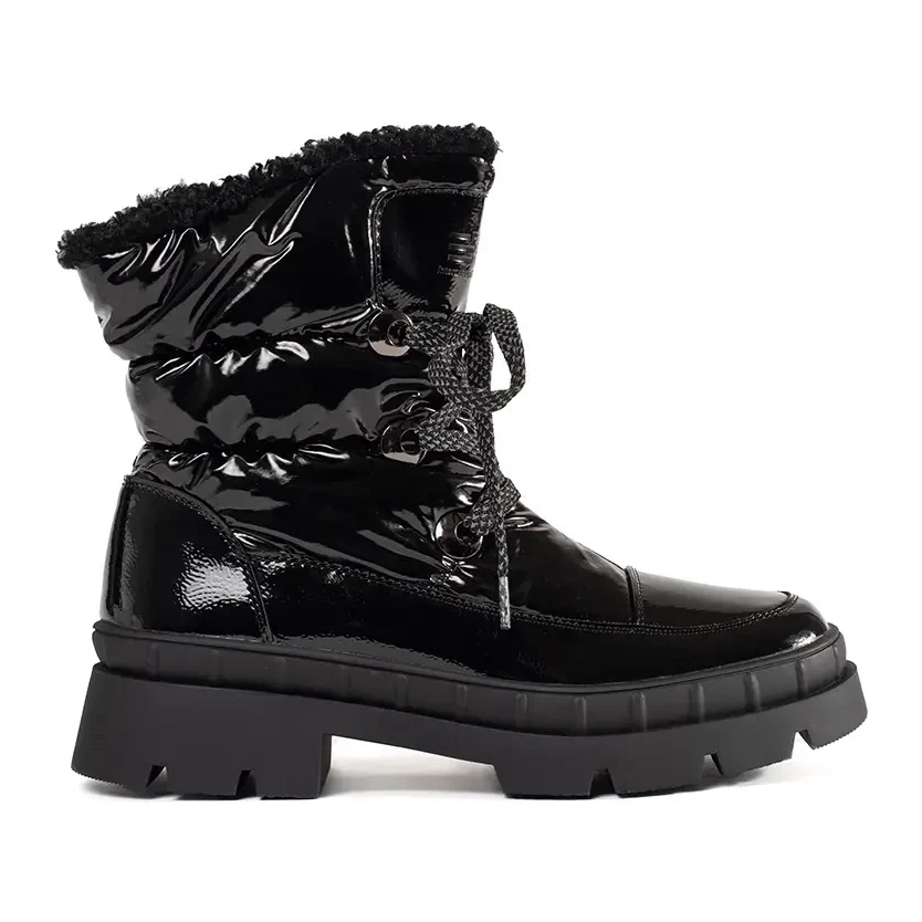Svarta snöstövlar kännetecknas av en platt klack på 5 cm och en skafthöjd på 14 till 15 cm, vilket gör att de perfekt skyddar benen mot kyla. Tack vare den trampade plastsulan ger skorna stabilitet och grepp på olika underlag.