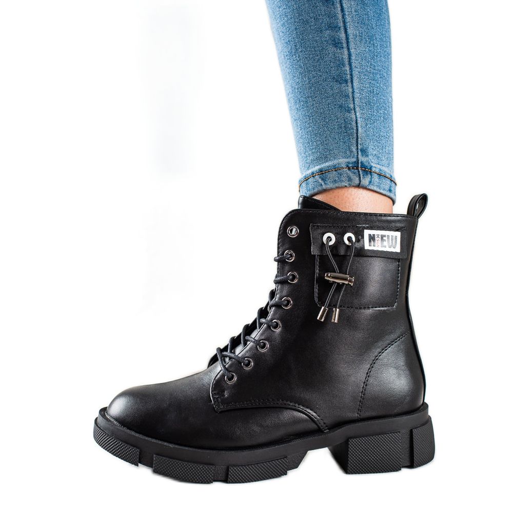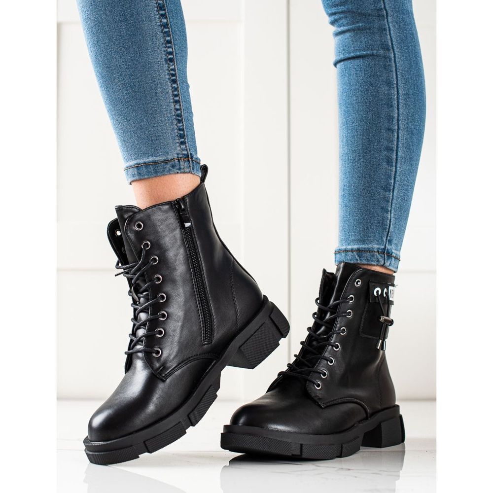 Svarta arbetarstövlar kännetecknas av en dekorativ rand som gör dem originella och sticker ut från mängden. Den runda tån och 4 cm platta hälen säkerställer komfort under långa promenader, och dragkedjan och snörningen gör den lätt att ta på och anpassa efter foten.