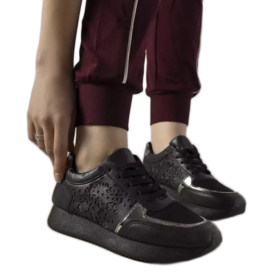 Svarta sportsneakers med ett genombrutet festivalmönster är ett perfekt val för kvinnor som värdesätter stil och komfort. Tillverkade av högkvalitativt ekologiskt läder, kommer dessa skor att vara det perfekta komplementet till varje vardagsstyling. Deras ovansida dekorerad med ett subtilt genombrutet mönster med ett glittrigt bottenskikt ger dem en unik karaktär som kommer att dra till sig uppmärksamhet.