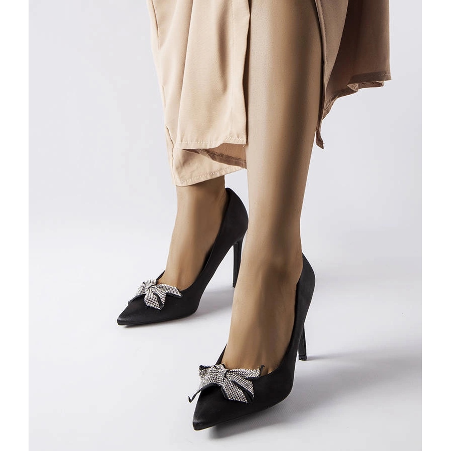 Svarta höga klackar med en satinfinish med en båge - elegans och stil för varje tillfälle