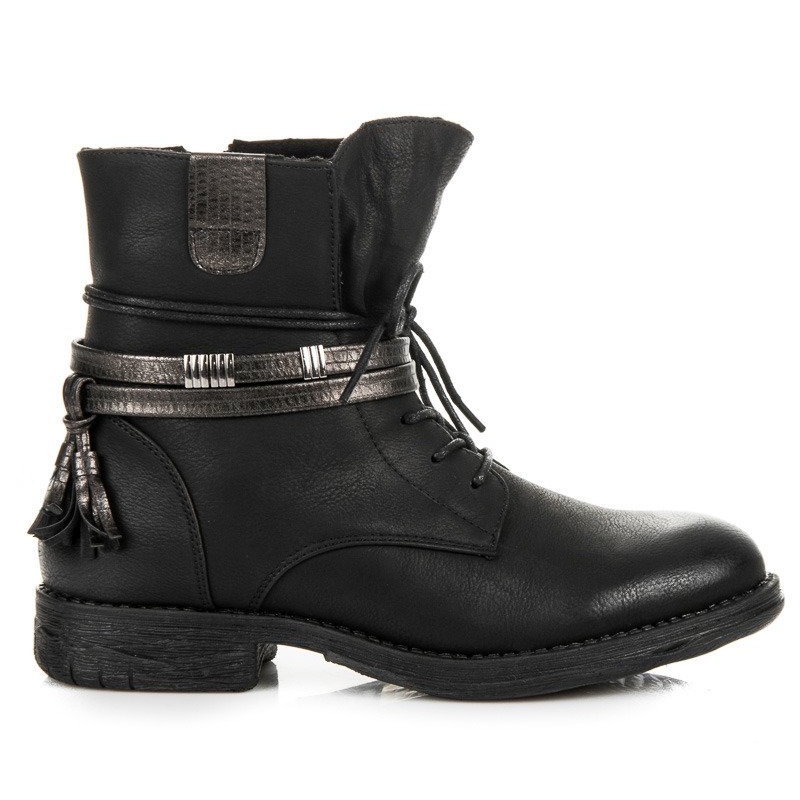 Den svarta färgen på dessa stövlar gör dem universella och passar perfekt till olika stilar, både avslappnade och mer eleganta. Dessutom lägger det dekorativa spännet och fransarna till en intressant accent, vilket framhäver skons boho-stil.