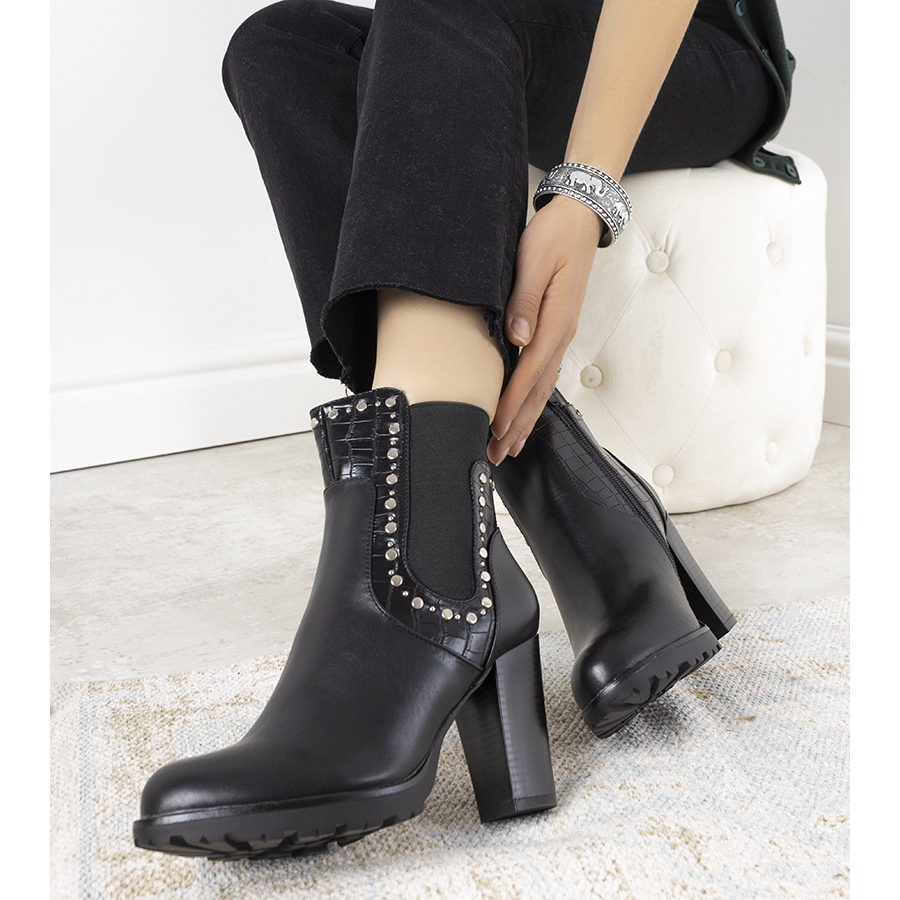 Svarta stövlar med Flamand nitar är ett absolut måste denna säsong! Dessa snygga skor kommer säkert att locka uppmärksamhet och framhäva vilken stil som helst. Den höga hälen förlänger benen perfekt och tack vare plattformen bibehålls bärkomforten, även på högre höjd.