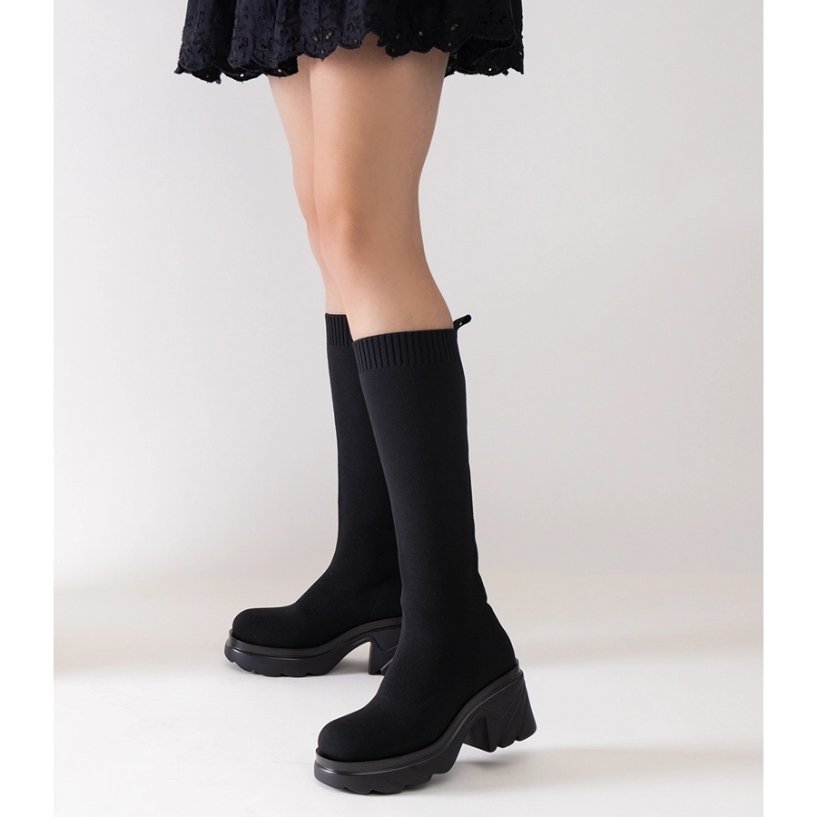Svarta stövlar med en elastisk Nimroda -övre är det perfekta valet för kvinnor som värderar både stil och komfort. Deras klassiska design med en rund näsa och en platt häl med plattformen gör dem perfekta för varje dag, men kompletterar också perfekt den eleganta stiliseringen för kvällsutflykter.