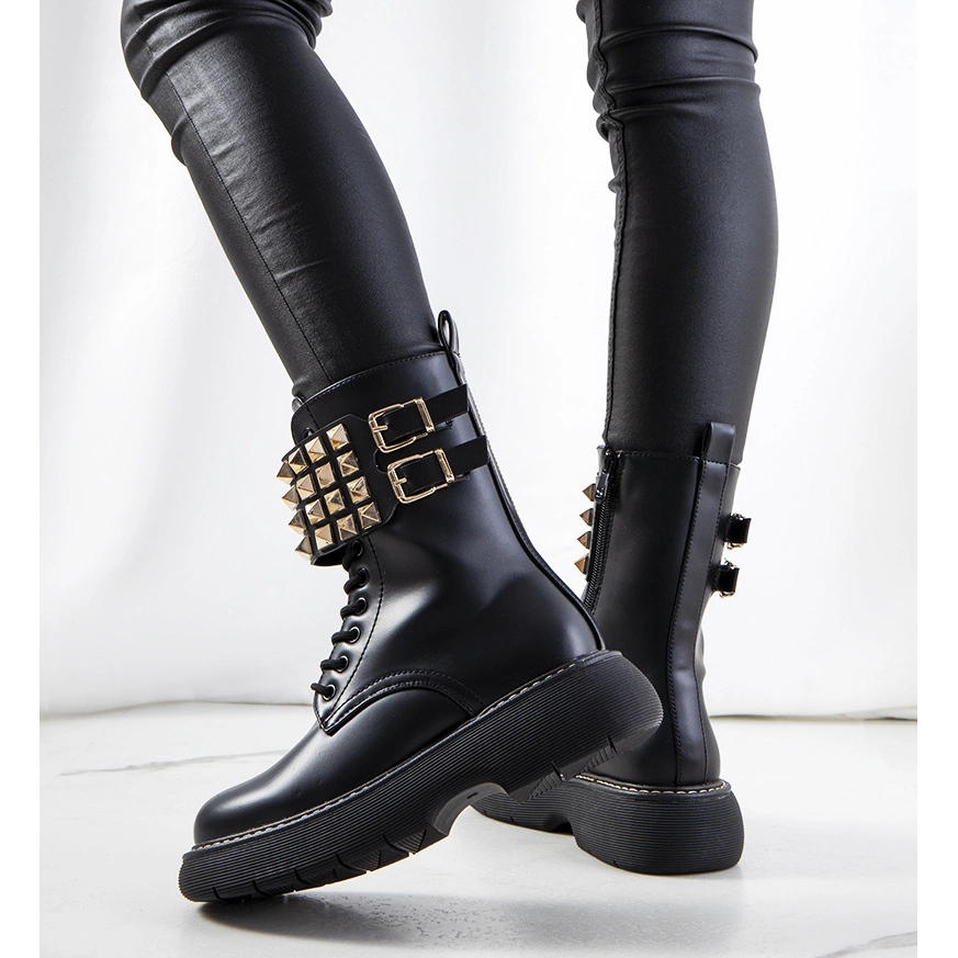 Vi presenterar svarta stövlar med Lacer nitar från märket PA1, som säkerligen kommer att ge karaktär till varje styling! Dessa modeskor kombinerar fantastisk design med högkvalitativt utförande. Ovandeln dekorerad med guldnybbar gör att stövlarna ser fantastiska och iögonfallande ut. Den höga sulan framhäver benen subtilt, och den platta hälen säkerställer bärkomfort hela dagen.
