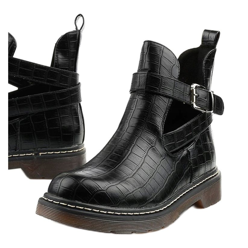 Svarta Nillda stövlar med spänne är ett perfekt val för moderna kvinnor som söker elegans i kombination med lite avantgarde. Ovandeln är gjord av ekologiskt läder och imponerar med en struktur som liknar ormskinn, vilket ger dem en unik karaktär. Exponerade anklar och en subtil spänne gör att denna modell kombinerar stil och komfort, perfekt matchar säsongens trender.