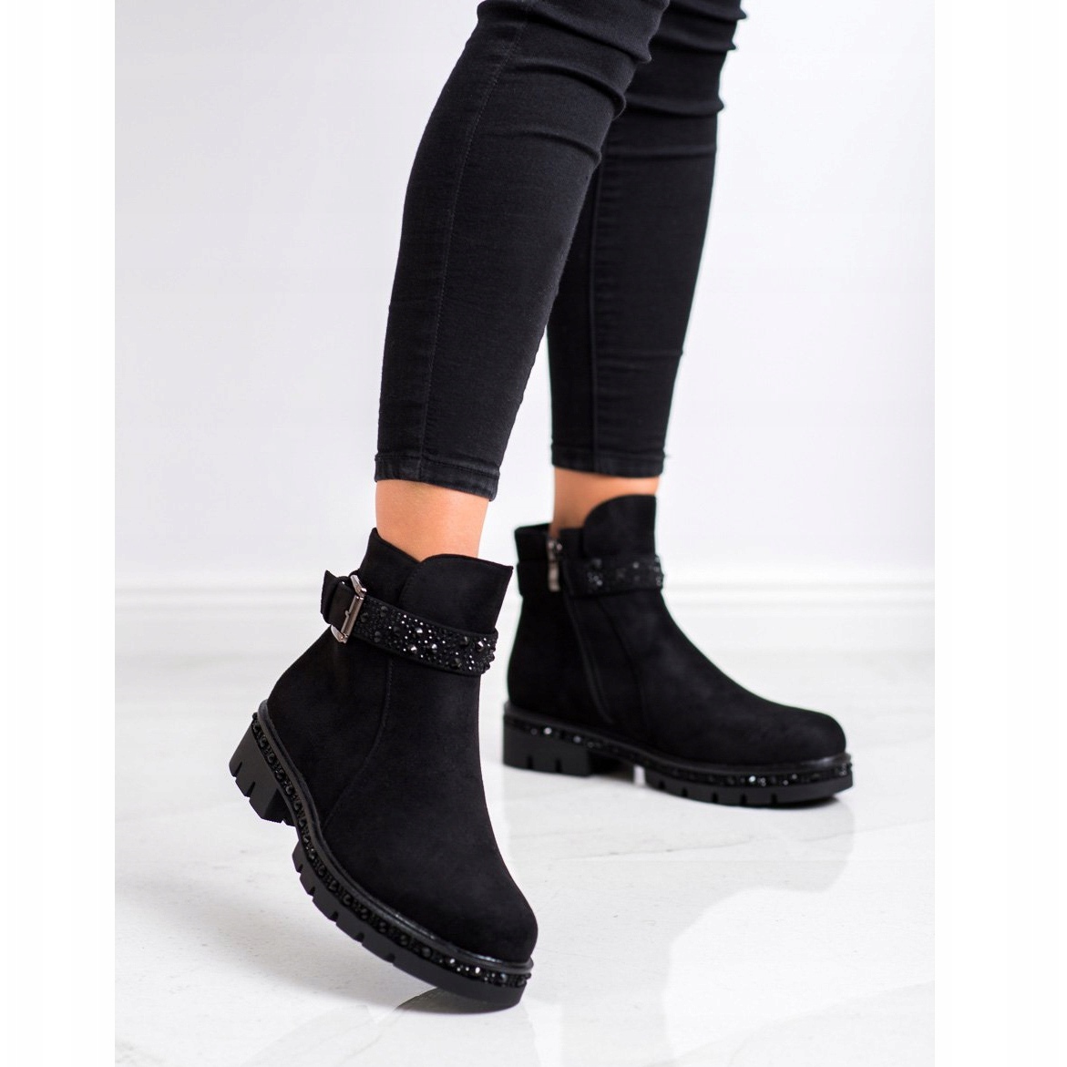 - **Dekorationer**: Strass och ett dekorativt bälte med kristaller som ger stövlarna en originell karaktär