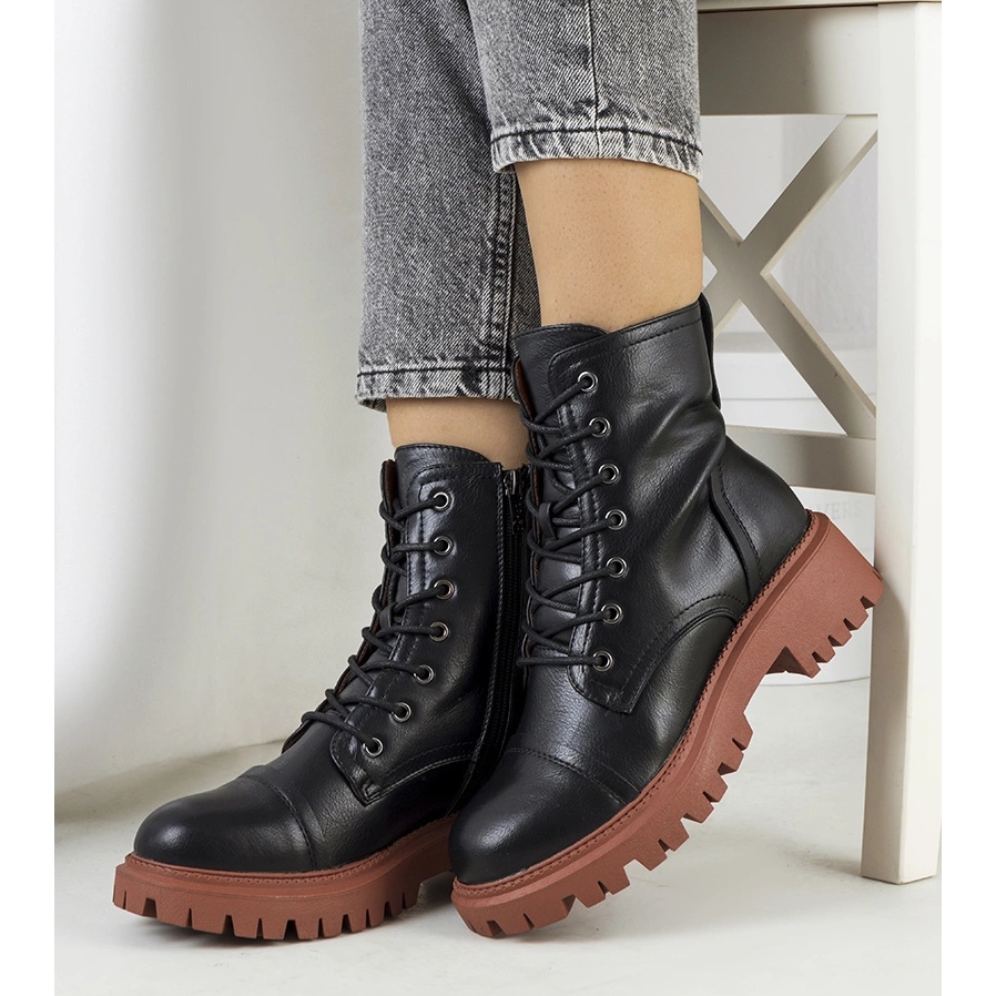 Black Trappers på Brown Sole Rukit - måste ha säsong och kombinera en modern look med praktisk funktionalitet. Den övre delen av ekologiskt läder av hög kvalitet ger en elegant effekt och enkel underhåll, och den bruna gummisula och 5 cm plattformen ger god isolering från den svala marken. Interiören fodrad med varm päls garanterar termisk komfort på kalla dagar. Ankelmodellen (20,5 cm skoshöjd) med en rund näsa har standardnumrering - följ din storlek. Kast av blixtlås och snörning underlättar passformen och sätter snabbt på. Insatsen är tillverkad av tyg, platt häl - bekvämlighet varje dag. Produkten kommer från tillverkaren, ett annat märke, levererat i originalrutan. Perfekt för höst-vinter-stiliseringar för jeans, läderbyxor eller kappor, de kommer att arbeta för både en promenad och till staden.