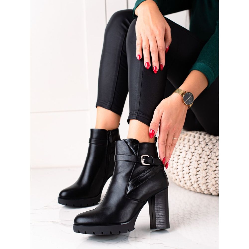 Svarta högklackade ankelstövlar från Bestelle är ett mångsidigt val för olika tillfällen - från tillfälliga möten, genom fester, till kvällsutflykter. Vänta inte, berika din garderob med denna fashionabla och eleganta modell som säkert kommer att dra till sig uppmärksamhet!