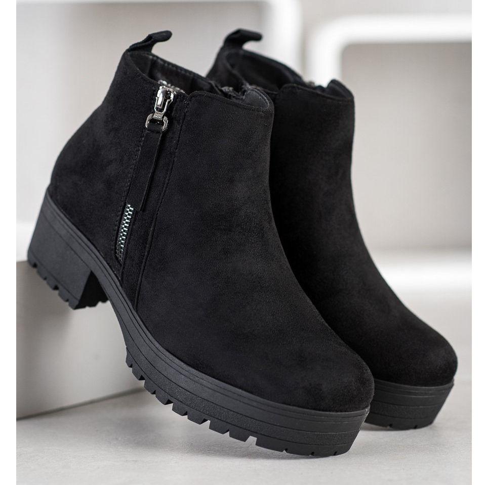 Den isolerade interiören säkerställer komfort under kallare dagar, och dragkedjan gör det enkelt att ta av och på skorna. Stövlarna har en skafthöjd på 9-10 cm, vilket framhäver benen positivt och får dem att se fenomenala ut i kombination med olika kläder. Den runda näsan ger dem subtilitet, och den styvade hälen garanterar stabilitet.