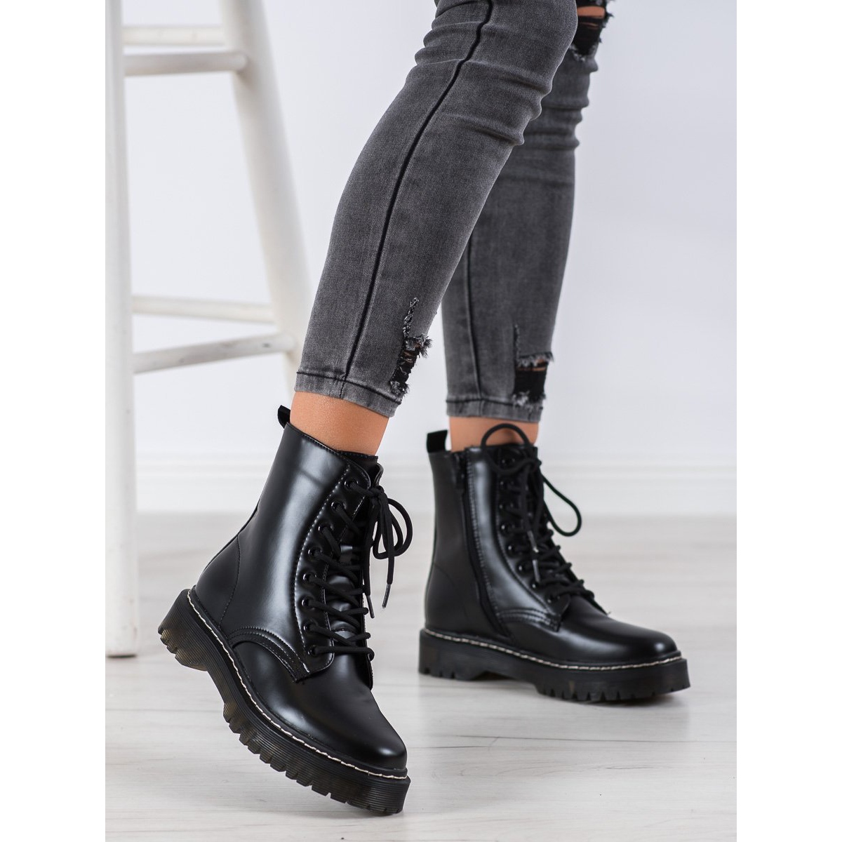 Svarta SHELOVET bovver boots är ett universellt garderobselement som enkelt kan kombineras med olika stilar. Oavsett om du ska ta en promenad, till jobbet eller för att träffa vänner så kommer de att se bra ut. I ett paket med tillverkarens originalkartong är de också en bra presentidé för alla älskare av unika skor.