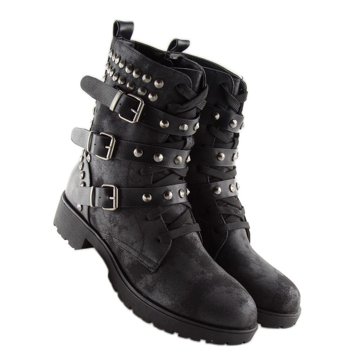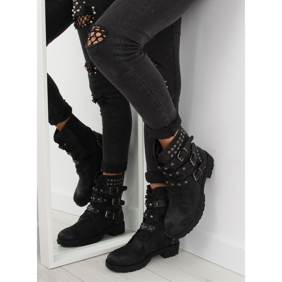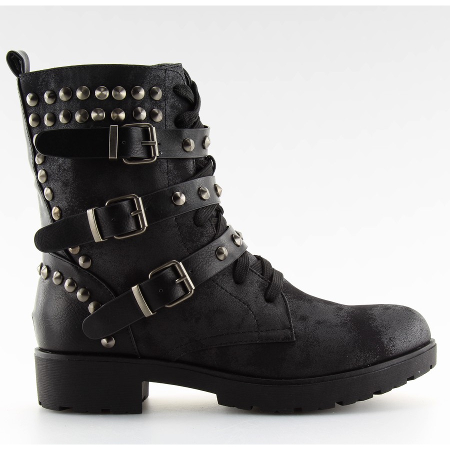 Vi presenterar svarta stövlar FC-H123 svarta - perfekta för kvinnor som värdesätter inte bara stil, utan också komfort och funktionalitet. Dessa extremt fashionabla arbetare i militärstil är dekorerade med spännen och många dubbar, och originala skavsår ger dem en unik karaktär. Tack vare dem kommer du säkert att sticka ut från mängden!