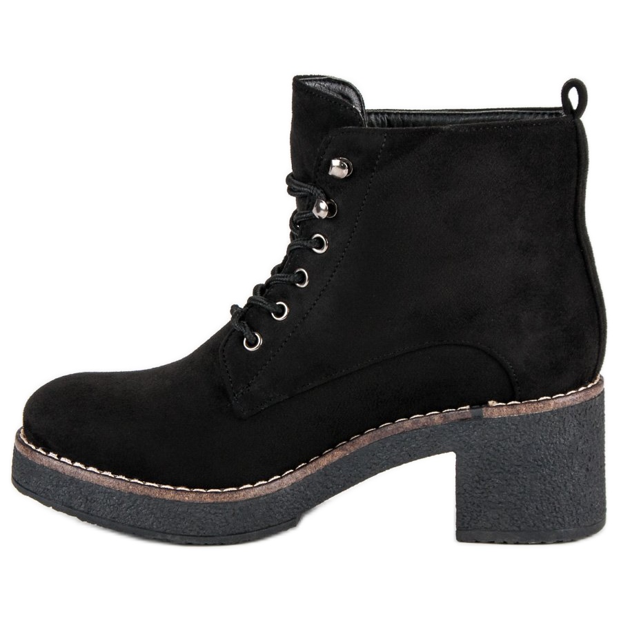 Tack vare en snörning framtill och en stabil 6,5 cm blockklack passar dessa skor perfekt till alla fötter, och deras ergonomiska snitt gör dem lätta och bekväma. Användningen av en sula med slitbana säkerställer säkert fotfäste även på hala underlag, vilket gör dem till ett idealiskt val för höst och vinter.