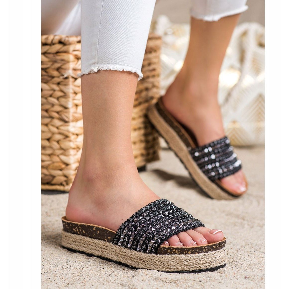 Gjorda av högkvalitativt textilmaterial, flip-flops ser attraktiva ut tack vare original dubbar som ger dem en unik karaktär. Deras universella svarta färg gör dem lätta att kombinera med olika stilar, och den öppna hälen säkerställer komforten att använda.